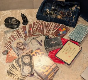 タロットは占歴30年以上!その他、虫占い(本物の虫が入った石を使い、裏表や虫の種類、向きなどで占う)・トートタロット・歌占・妖怪タロット・アトランティスタロット・西洋占星術・九星気学・手相・ダウジング・アストロダイス・チャクラ診断
